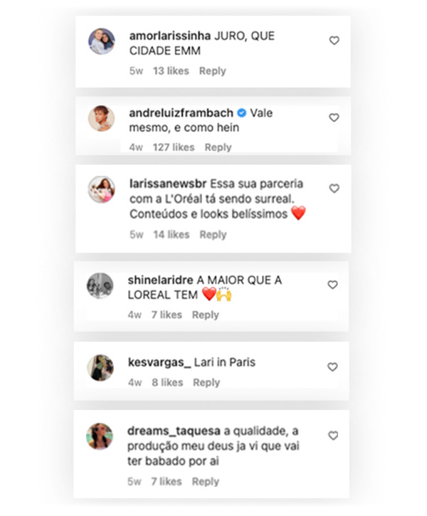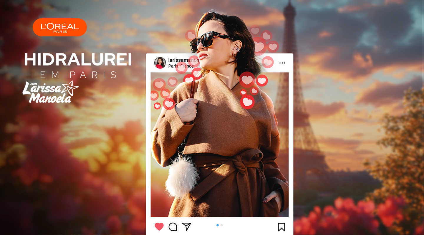 Enviamos a embaixadora da marca, Larissa Manoela, para participar da Paris Fashion Week, quando L’Oréal Paris promove o Le Défilé, seu exclusivo desfile de tendências, que tem o propósito de empoderar as pessoas. Na websérie “Hidralurei em Paris”, Larissa protagonizou e fez os mais de 80 milhões de seguidores se sentirem parte de seu roteiro por cenários incríveis da cidade luz: da chegada ao aeroporto Charles de Gaulle, aos principais laboratórios da marca, passando pelo jantar com as embaixadoras globais de L’Oréal Paris e, claro: a 1ª fila de um desfile no maior evento de moda do mundo.